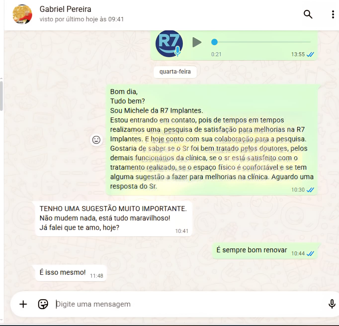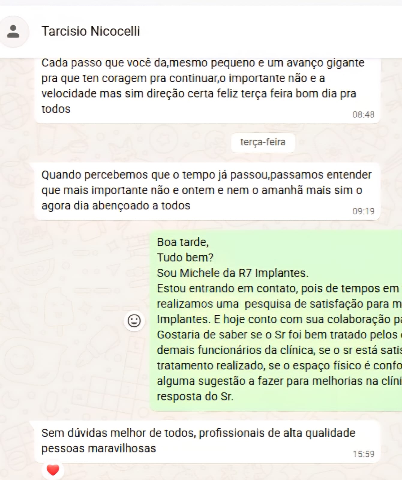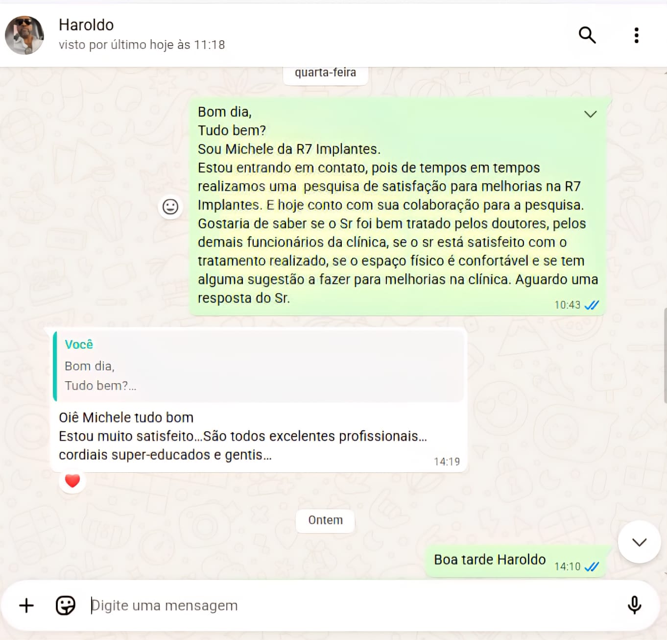 EXCELENTE Com base em 49 avaliações Publicado em Studio di Bellezza M Montan02/04/2025Trustindex verifica se a fonte original da avaliação é Google. Dra Aline é maravilhosa uma profissional exemplar e mto educada parabéns pelo profissionalismo ❤️Publicado em evandro dantas01/04/2025Trustindex verifica se a fonte original da avaliação é Google. primeiramente quero agradecer a Dra aline e a dra juliana pelo excelente trabalho , cheguei sem esperança e sair do consultorio realizado meu implante ficou perfeito ! resultado além do que eu esperava. parabéns a toda equipe por toda atenção que estiveram comigo só gratidão a todos vocês !Publicado em Emanuel Pereira24/10/2023Trustindex verifica se a fonte original da avaliação é Google. Estar , sendo muito tranquilo e satisfatório ,o atedimento e excelente de toda a equipe..Publicado em Tânia Canholato15/08/2023Trustindex verifica se a fonte original da avaliação é Google. A R7 Clínica, indico para todos que precisam de tratamento, oferece qualidade, capacidade e competência. Recebem com carinho, atenção e cuidado. Todos tem um carisma enorme! Excelência no atendimento. Fiquei encantada com tudo. Parabéns a todos!Publicado em wendell cardoso30/05/2023Trustindex verifica se a fonte original da avaliação é Google. Ótima clínica! É a única que eu confio e só vou nela. Podem ir sem medo!Publicado em PAULA FERNANDA TRACANELLA30/05/2023Trustindex verifica se a fonte original da avaliação é Google. Atendimento de excelência!!! Indico!!!Publicado em Evelyn Cristina30/05/2023Trustindex verifica se a fonte original da avaliação é Google. Sem dúvida é um lugar com excelentes profissionais, vcs estão de parabéns que equipe maravilhosa só tenho a agradecer a todos pelo tratamento por nos receber dando total atenção.Certificado: TrustindexO selo verificado do Trustindex é o Símbolo Universal de Confiança. Apenas as melhores empresas podem obter o selo verificado que tem uma pontuação de avaliação acima de 4.5, com base nas avaliações dos clientes nos últimos 12 meses. Leia mais