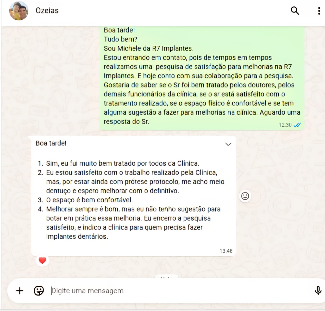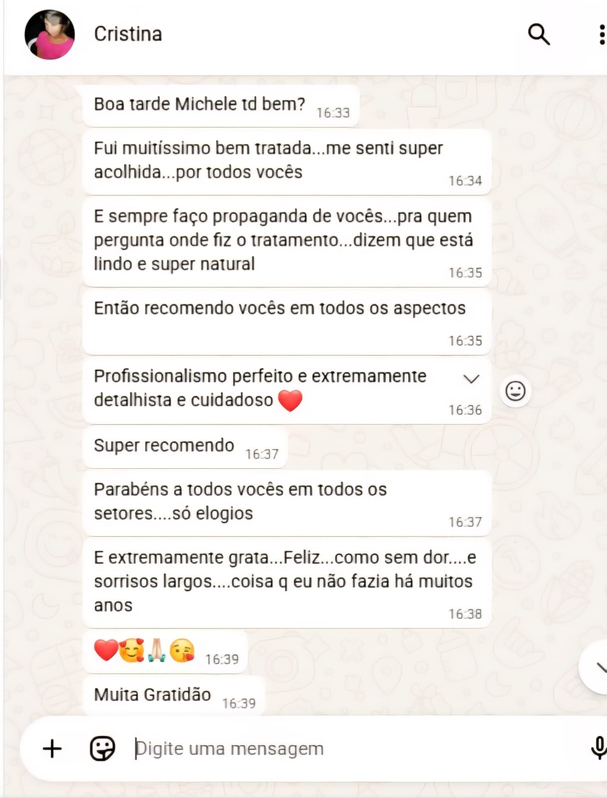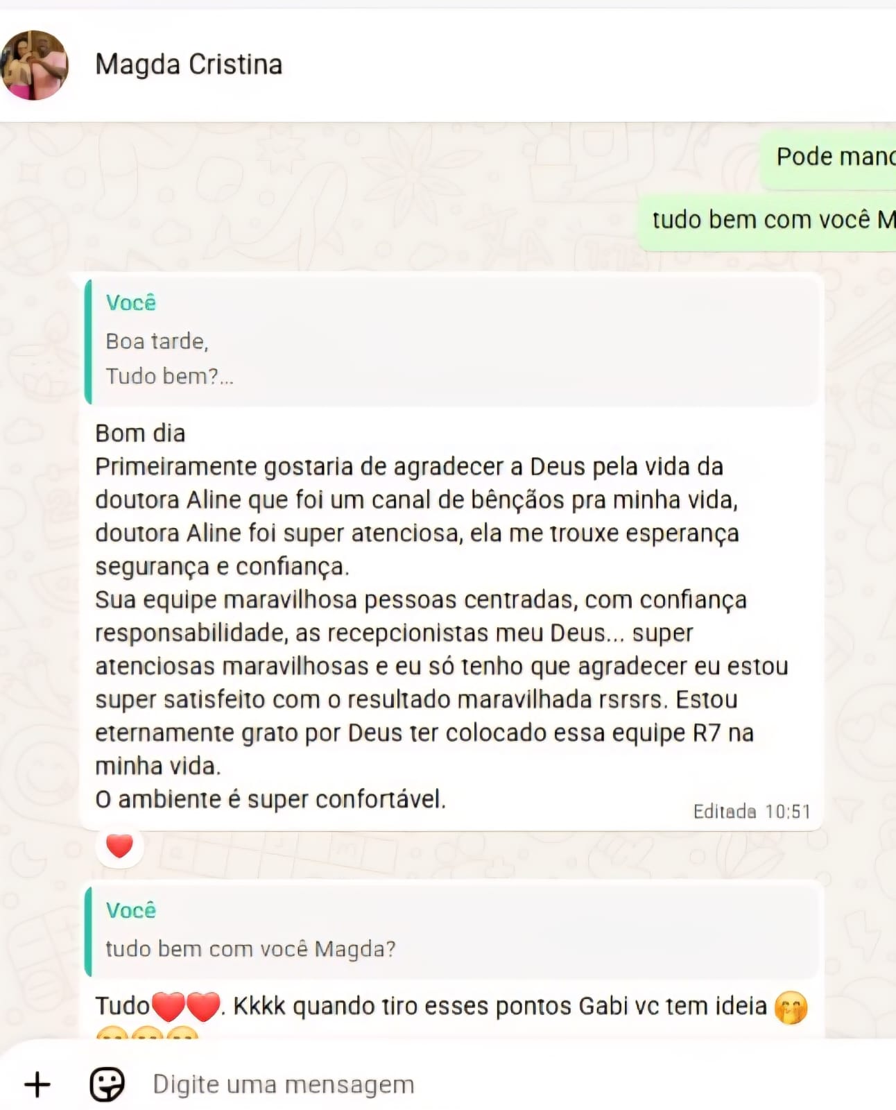 Dos tratamentos que fiz, tenho a dizer que estou muito contente com a R7 Implantes, em especial com a Dra. Aline Ricette, e que por esse motivo continuo fazendo outros tratamentos na certeza que vou voltar a ter um sorriso bonito.