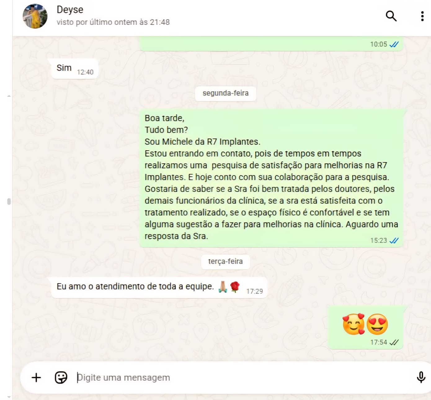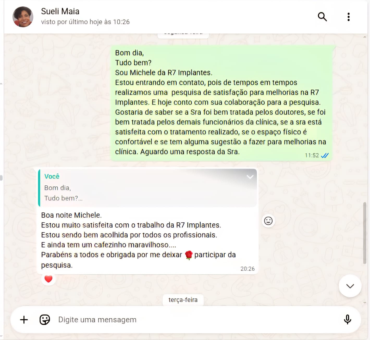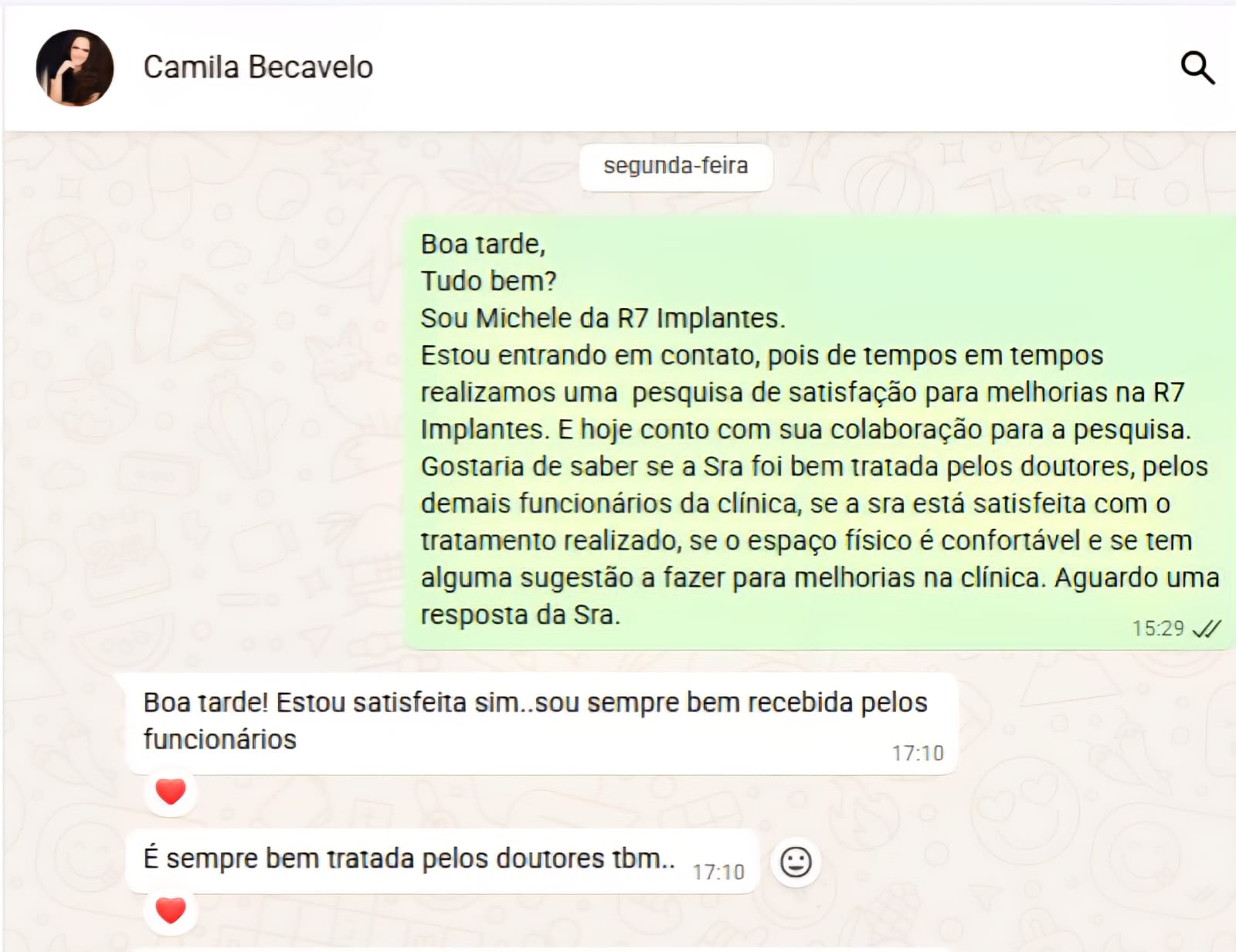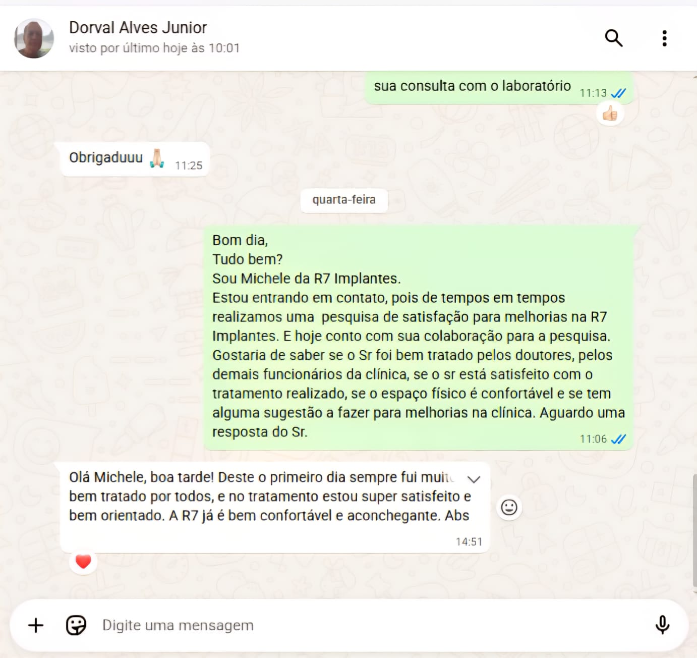 Dos tratamentos que fiz, tenho a dizer que estou muito contente com a R7 Implantes, em especial com a Dra. Aline Ricette, e que por esse motivo continuo fazendo outros tratamentos na certeza que vou voltar a ter um sorriso bonito.